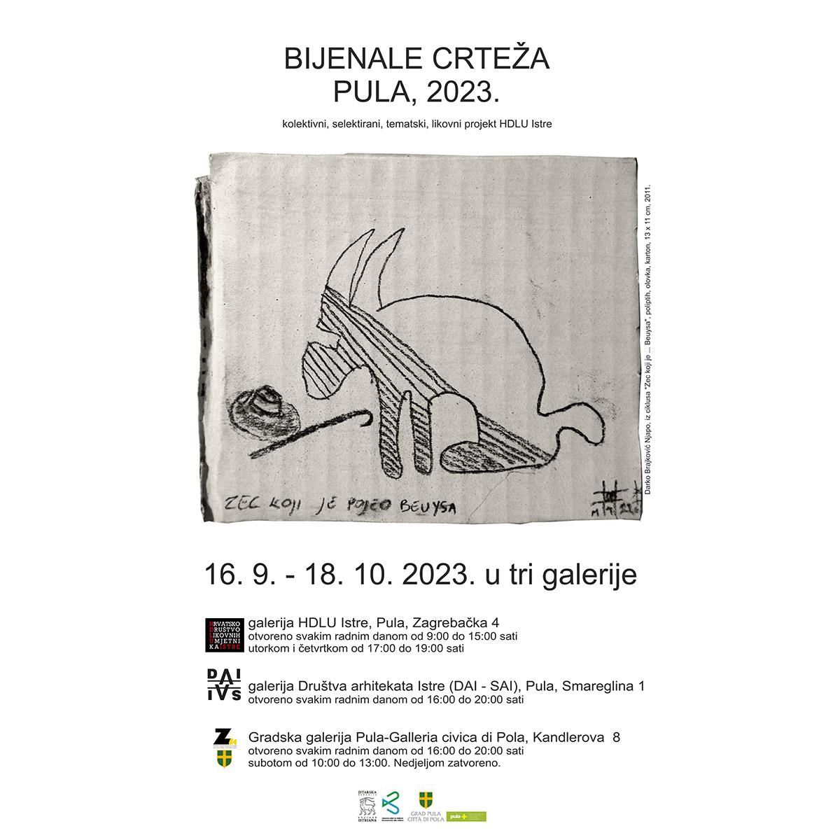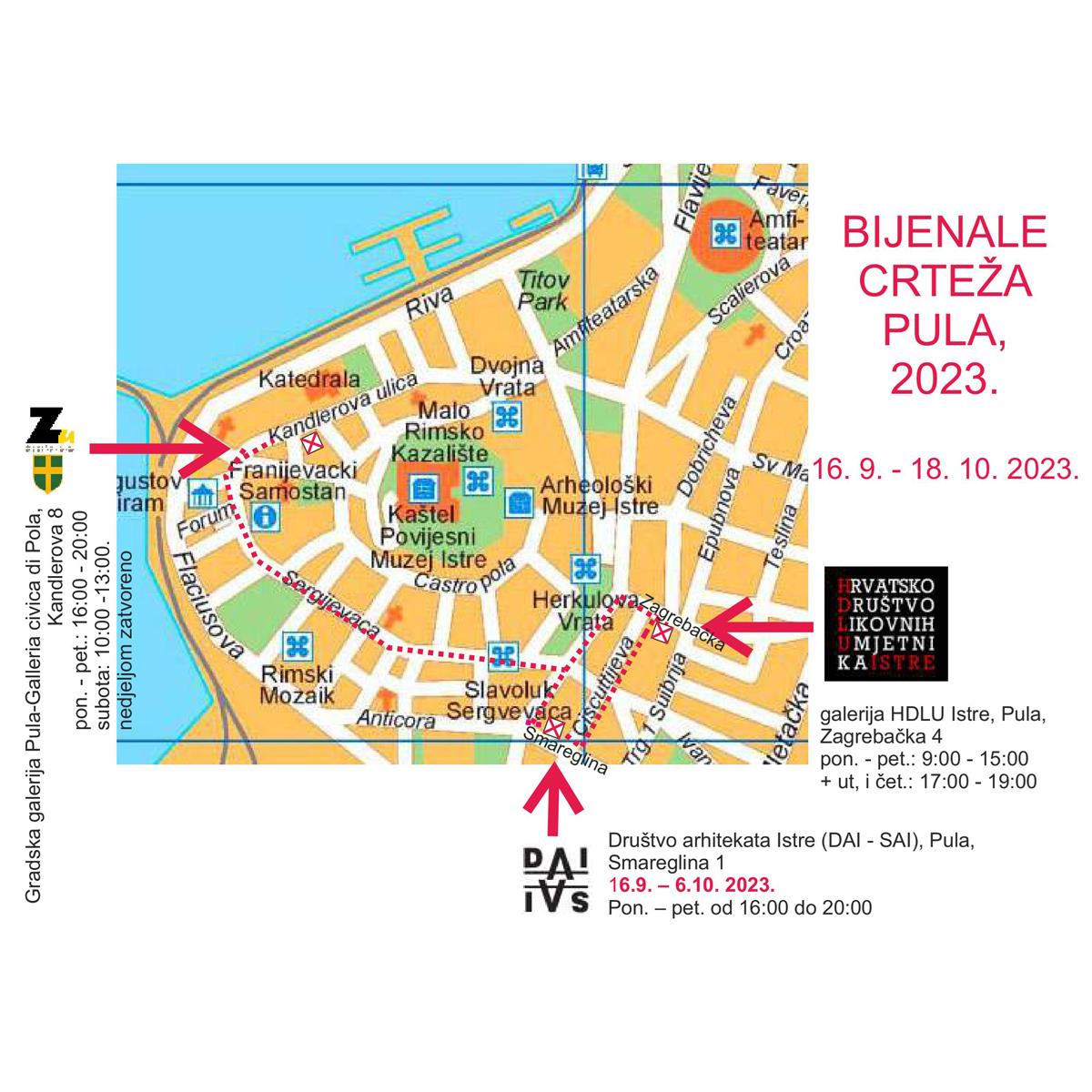 Postav bijenala crteža 2023. organiziran je u tri pulske galerije: Galerija DAI-SAI, Gradska galerija Pula i galerija HDLU-a Istre.